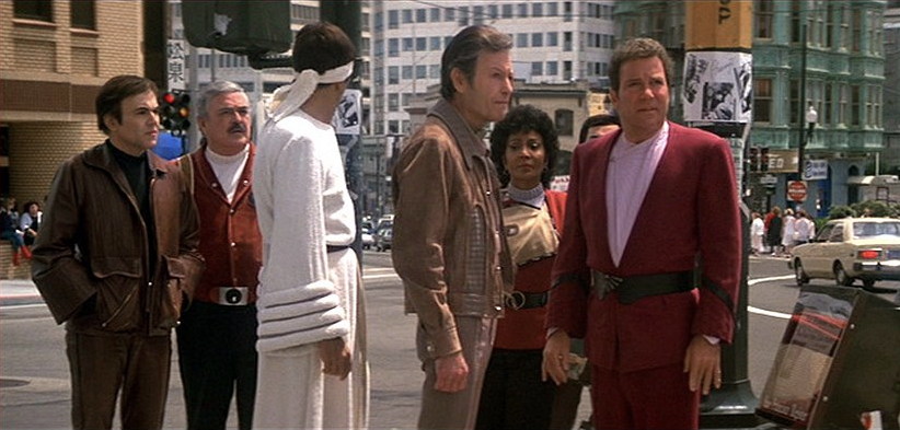 From there, the high concept narrative is actually pretty streamlined. The premise is a clever one: extinct humpback whales may be the solution to an alien probe aggressive actions that are destroying the Earth. To find some, Kirk and crew hazard a jump back in time (apparently that’s possible with a slingshot turn around the sun). Spock’s time warp computations prove accurate, of course, landing the crew in 1986 San Francisco.