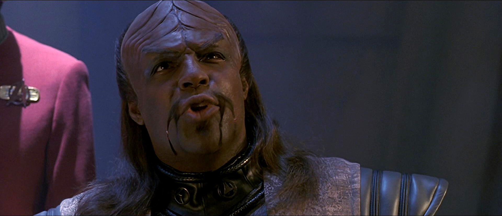 • The Klingon lawyer Worf seen here played by Michael Dorn is Colonel Worf, not Lieutenant Worf of The Next Generation. The Colonel is the grandfather of the Lieutenant.