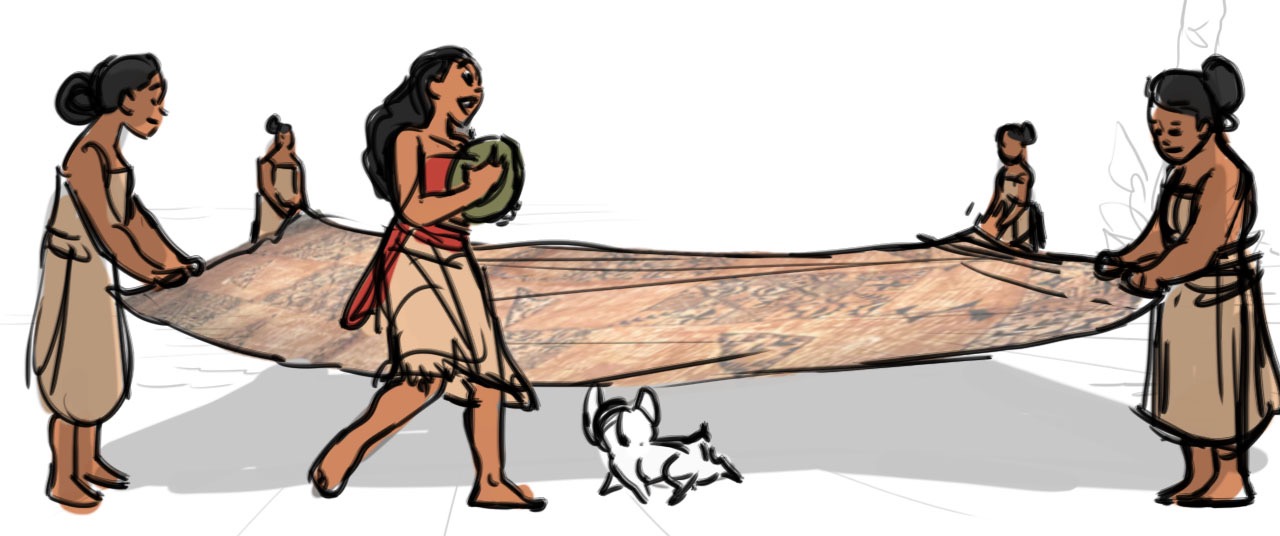 MOANA story boards inspired by research trip to Samoa. Features Story Artist David Derrick’s family tapa print. Artist: David Derrick, Story Artist.