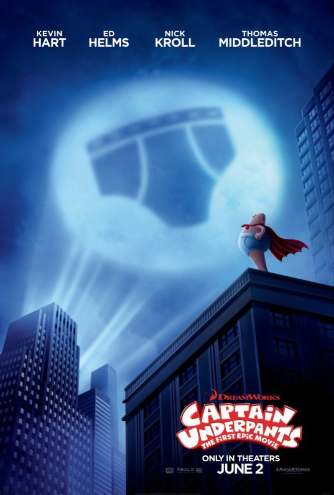 A perfect marriage of material and studio, the silly antics of the popular kids book series “Captain Underpants” fits DreamWorks Animation’s cartoonish brand like a snug pair of boxer briefs. Captain Underpants: The First Epic Movie – starring the voices of Kevin Hart, Ed Helms, Jordan Peele, Kristen Schaal, Thomas Middleditch, and Nick Kroll as the evil Professor Poopypants – flies into multiplexes this summer right after school’s out: June 2, 2017.