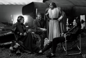 Carrie Fisher, writer/director Rian Johnson, Mark Hamill, and Lucasfilm CEO Kathleen Kennedy on set for STAR WARS: THE LAST JEDI
