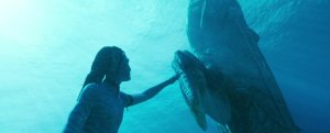 Sully (Sam Worthington) communes with a whale-like creature in director James Cameron’s AVATAR: THE WAY OF WATER (2022)