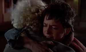 BackToTheFuture_MartyHug Marty McFly (Michael J. Fox) hugs Doc Brown at a crucial moment in BACK TO THE FUTURE (1985).