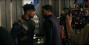 BlackPanter_FaceOffOnSet Michael B. Jordan and Chadwick Boseman play a scene on the set of Marvel’s BLACK PANTHER (2018)