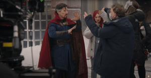 Sam Raimi directs Benedict Cumberbatch and Rachel McAdams on the set of DOCTOR STRANGE IN THE MULTIVERSE OF MADNESS (2022)
