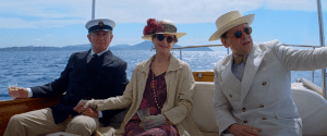 Robert and Cora Crawley (Hugh Bonneville and Elizabeth McGovern) go for a ride on a woodcraft boat in DOWNTON ABBEY: A NEW ERA (2022)