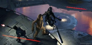 DuelOfTheFates_PoeChewieFightBonadan Poe and Chewbacca fight the Knights of Ren on the planet Bonadan in STAR WARS: DUEL OF THE FATES