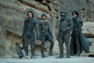 Rebecca Ferguson (Lady Jessica), Zendaya (Chani), Javier Bardem (Stilgar), and Timothée Chalamet (Paul Atreides) star in Denis Villeneuve’s adaptation of Frank Herbert’s epic sci-fi novel DUNE (2021)