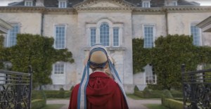 Harriet (Mia Goth) enters an Abbey in EMMA. (2020)
