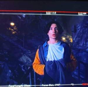 Ezra Miller stars as Barry Allen (The Flash) in THE FLASH (2022). Here, as seen from a monitor on-set during filming, Barry sees The Batcave for the first time.