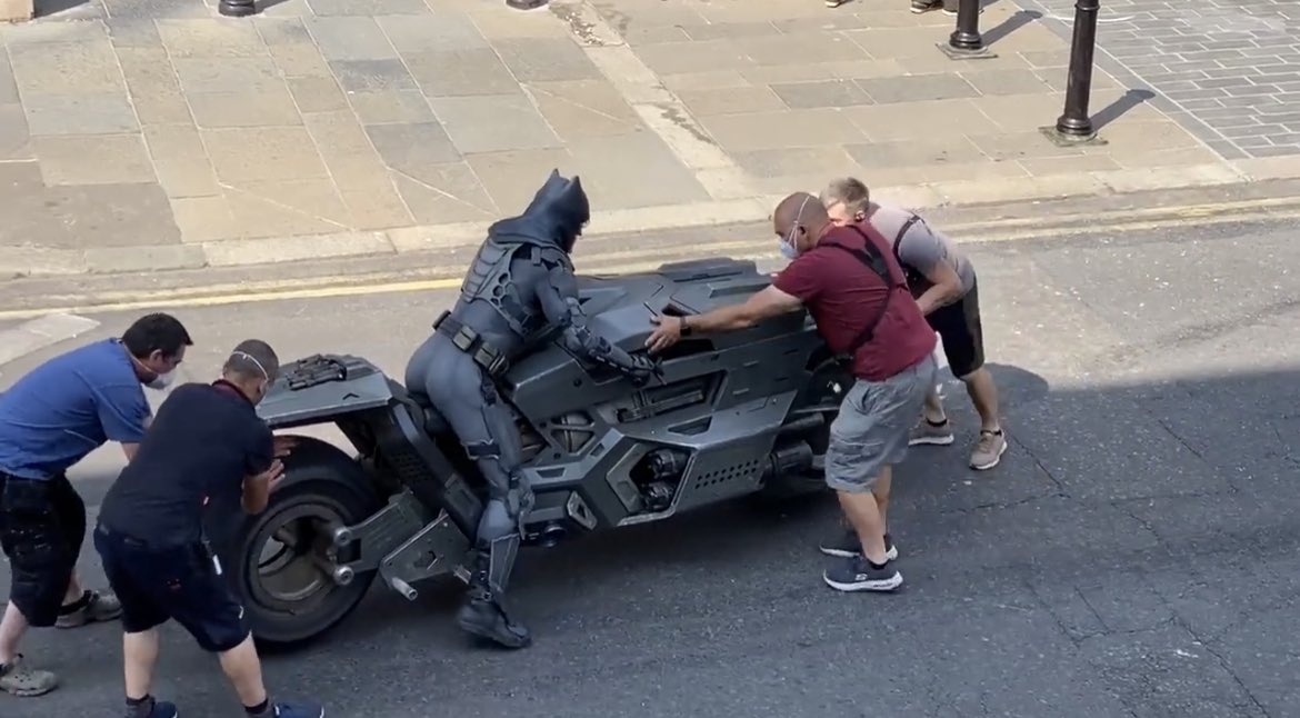 FlashSet_BatbikeCrewHelp A riding double is suited up as the Snyderverse version of Batman on the set of THE FLASH (2022)