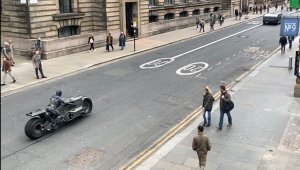 FlashSet_BatbikeStreet A riding double is suited up as the Snyderverse version of Batman on the set of THE FLASH (2022)