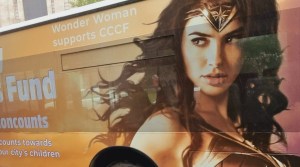 FlashSet_WWCityBusAd A city bus in Central City, with a charity ad featuring Wonder Woman, in THE FLASH (2022)