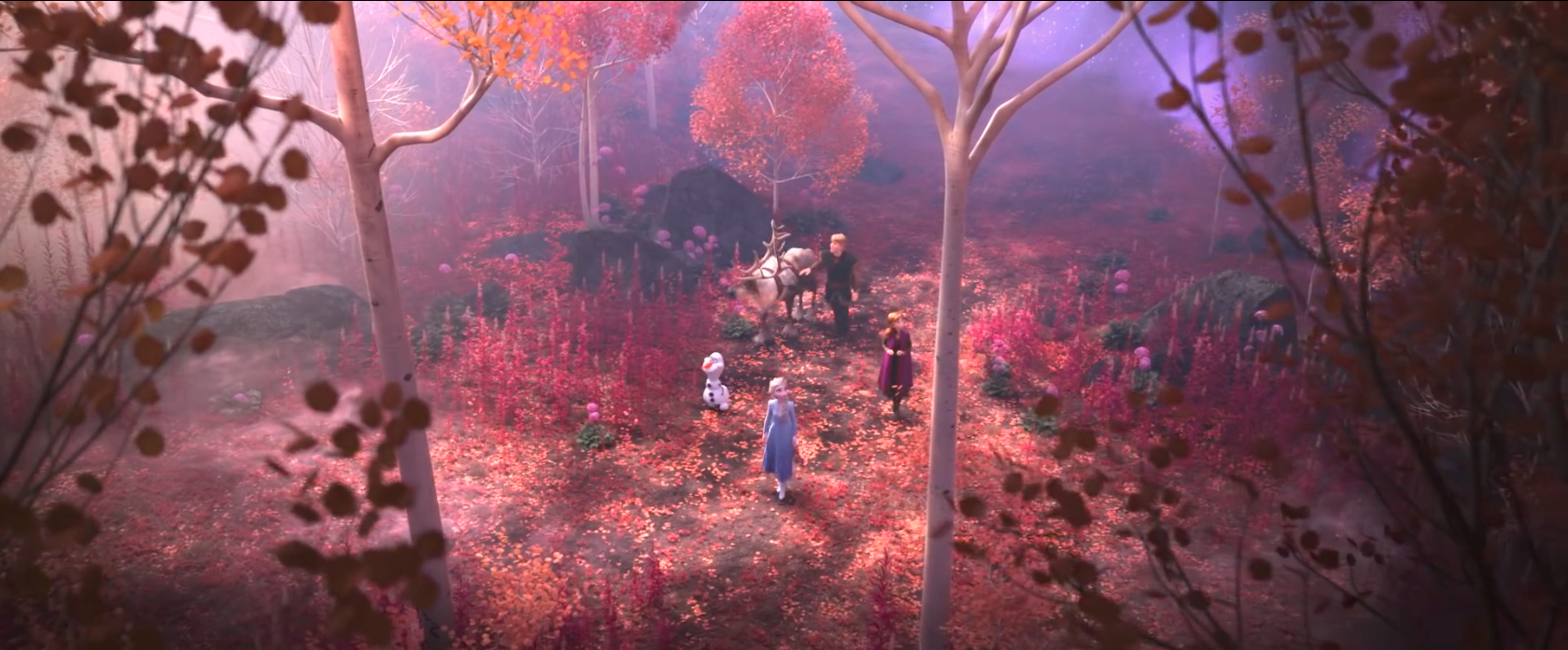 Elsa, Anna, Kristoff, Olaf and Sven explore an unknown forest in FROZEN II (2019)