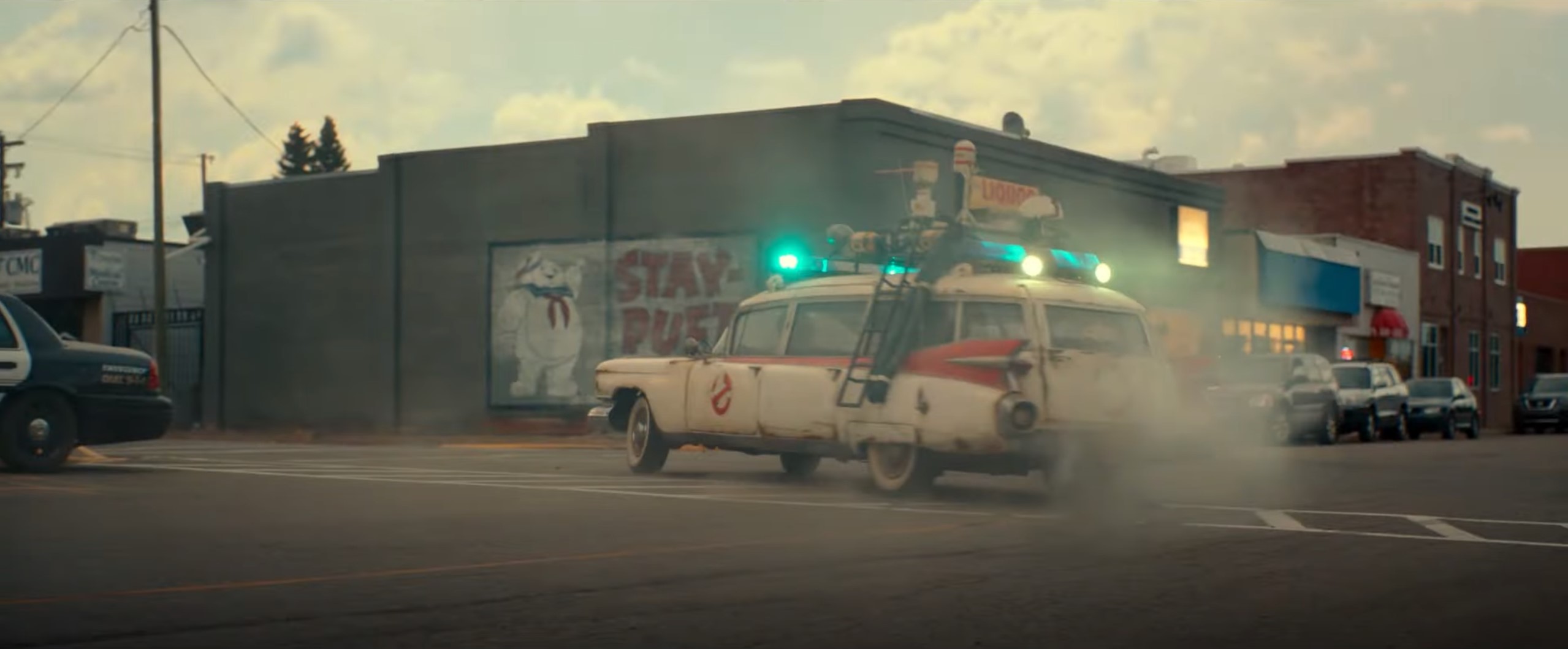 GhostbustersAfterlife_Ecto1Skid The Ecto-1 back in action, in the franchise reboot GHOSTBUSTERS: AFTERLIFE (2021)