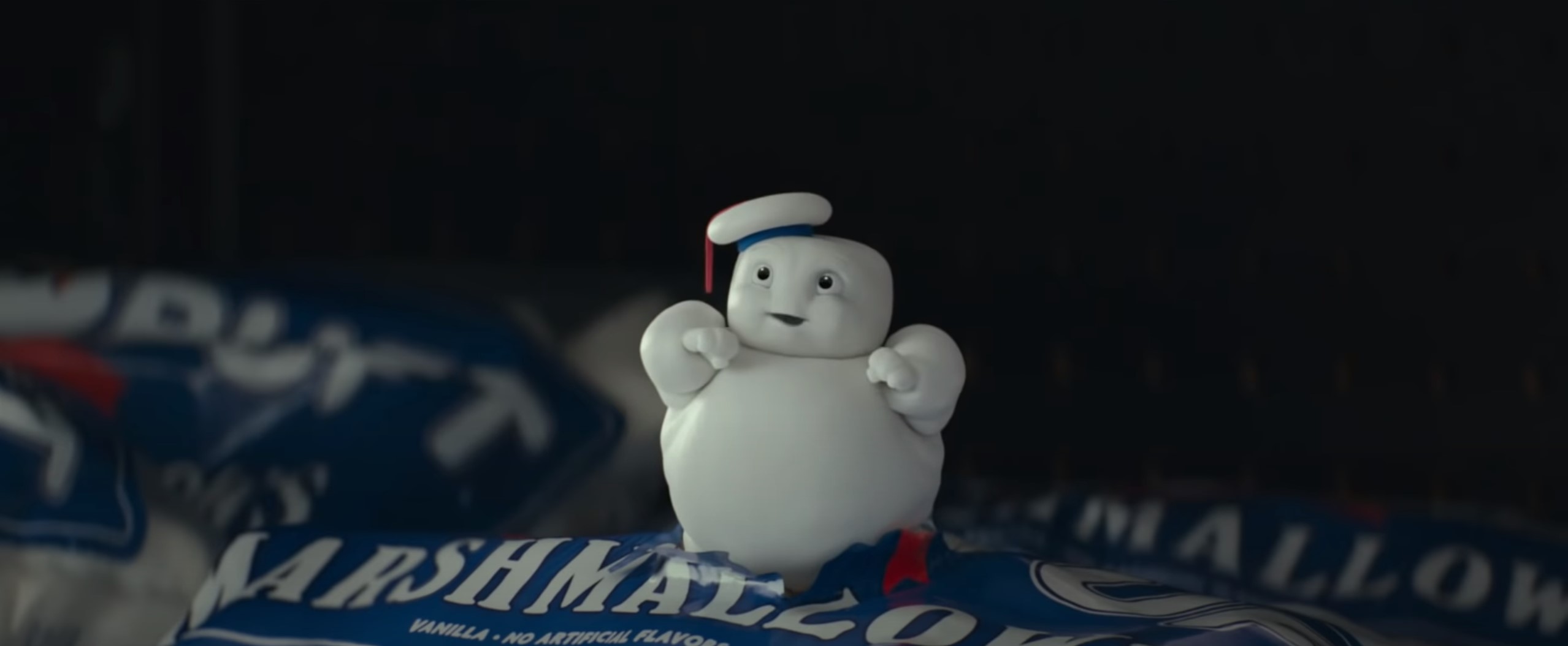 A mini Marshmallow Man emerges on a grocery shelf in the franchise reboot GHOSTBUSTERS: AFTERLIFE (2021)