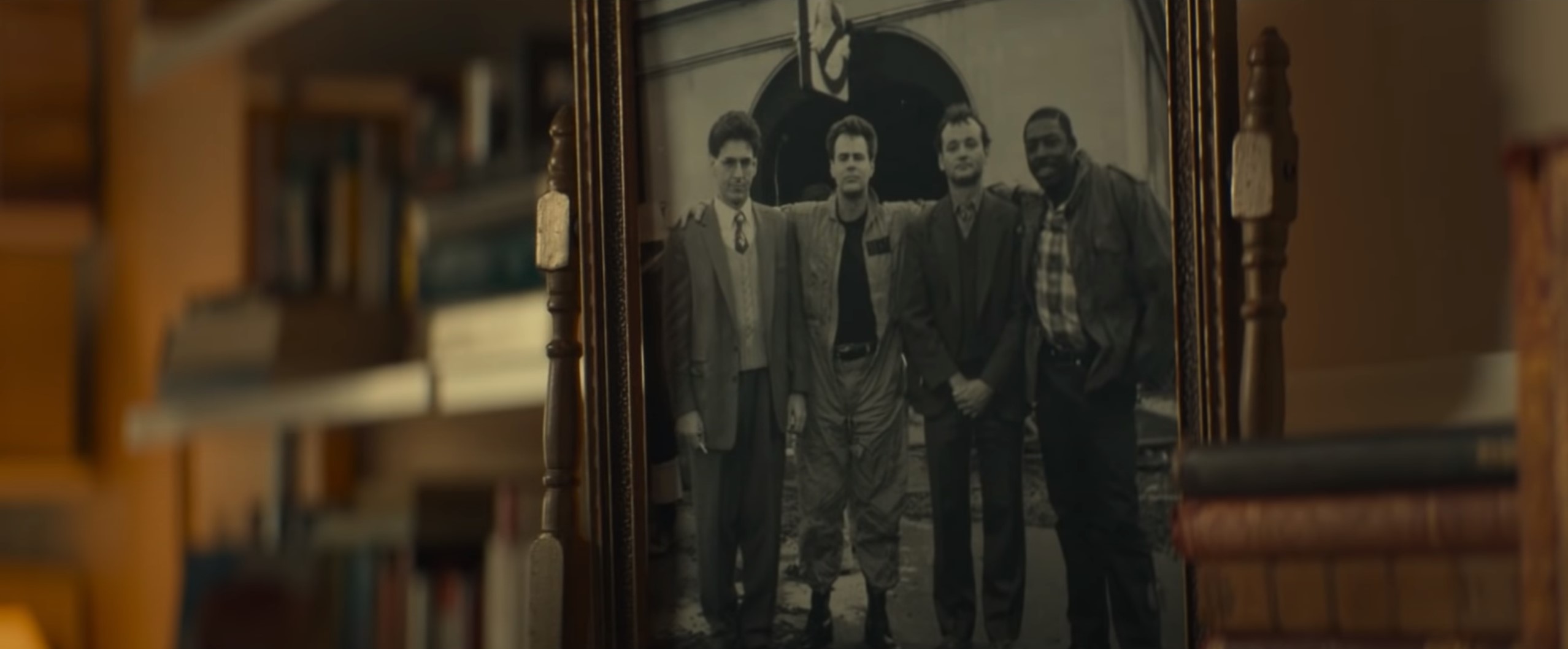A photograph of the original Ghostbusters, seen in the franchise reboot GHOSTBUSTERS: AFTERLIFE (2021)