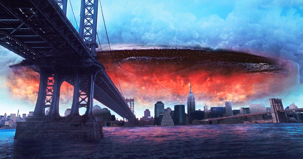 ID4_ShipOverNewYork A giant spaceship appears over New York City in the classic sci-fi disaster flick INDEPENDENCE DAY (1996)