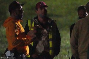 A stunt team (holding the Indy head mask) on the U.K. set of INDIANA JONES 5 (2022)