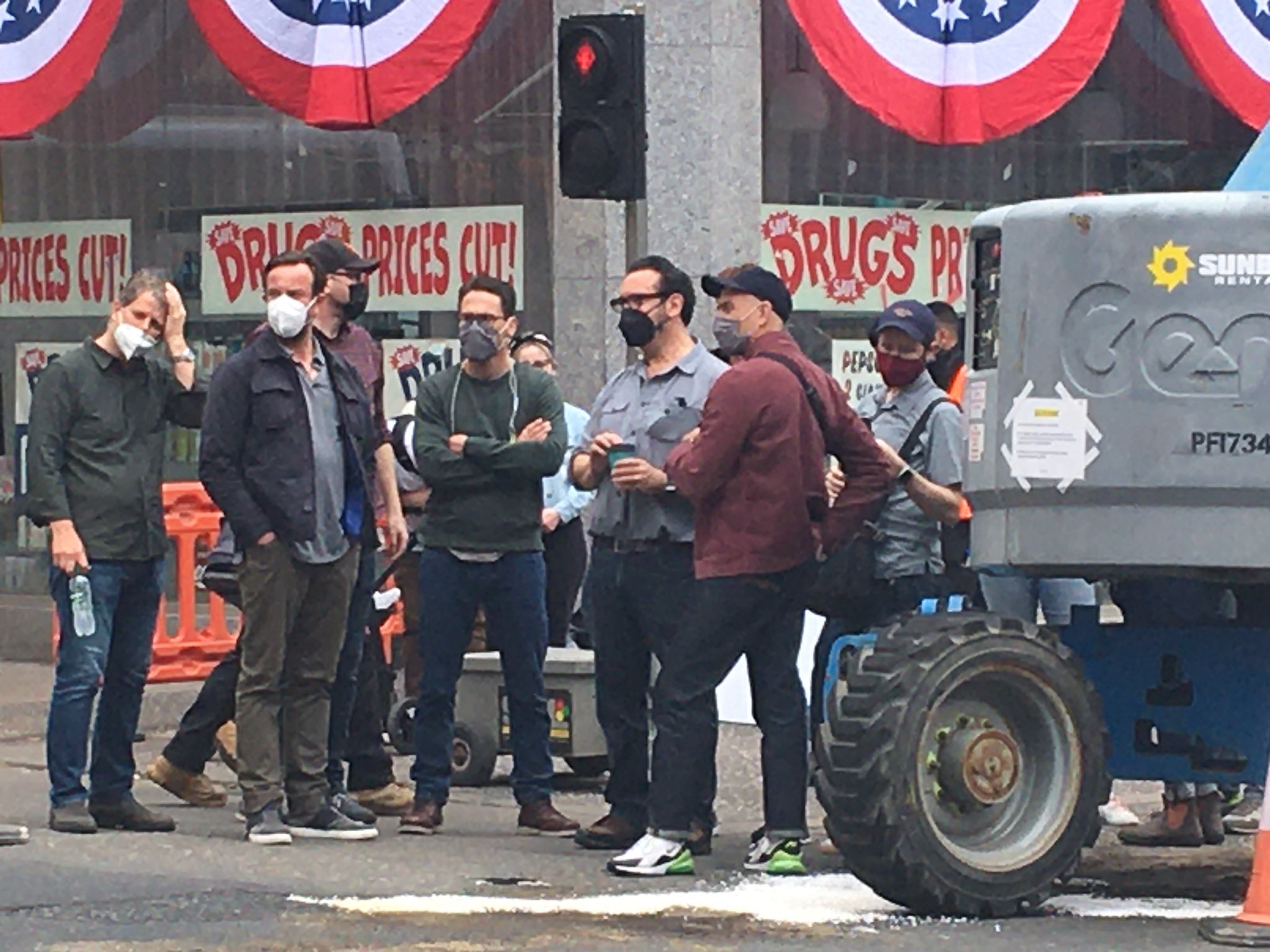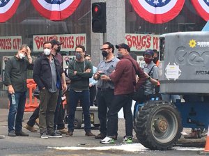 Indy5set_MangoldOnSet Director James Mangold (in gray shirt and black mask) on the Glasgow, Scotland set of INDY 5.