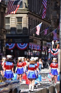 Patriotic cheerleaders are a part of the Apollo 11 ticker tape parade being re-created on the streets of Glasgow, Scotland for INDY 5.