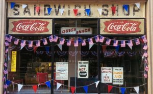 Indy5Set_Sandwichshop A sandwich shop in 1969 NYC, decorated on a ticker tape parade route for the Apollo 11 crew in INDY 5.