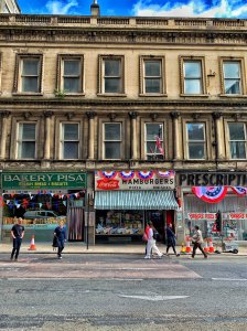 Indy5set_StoreStrip A Glasgow street is transformed to an NYC ticker tape parade route for the Apollo 11 crew in 1969, for INDY 5.