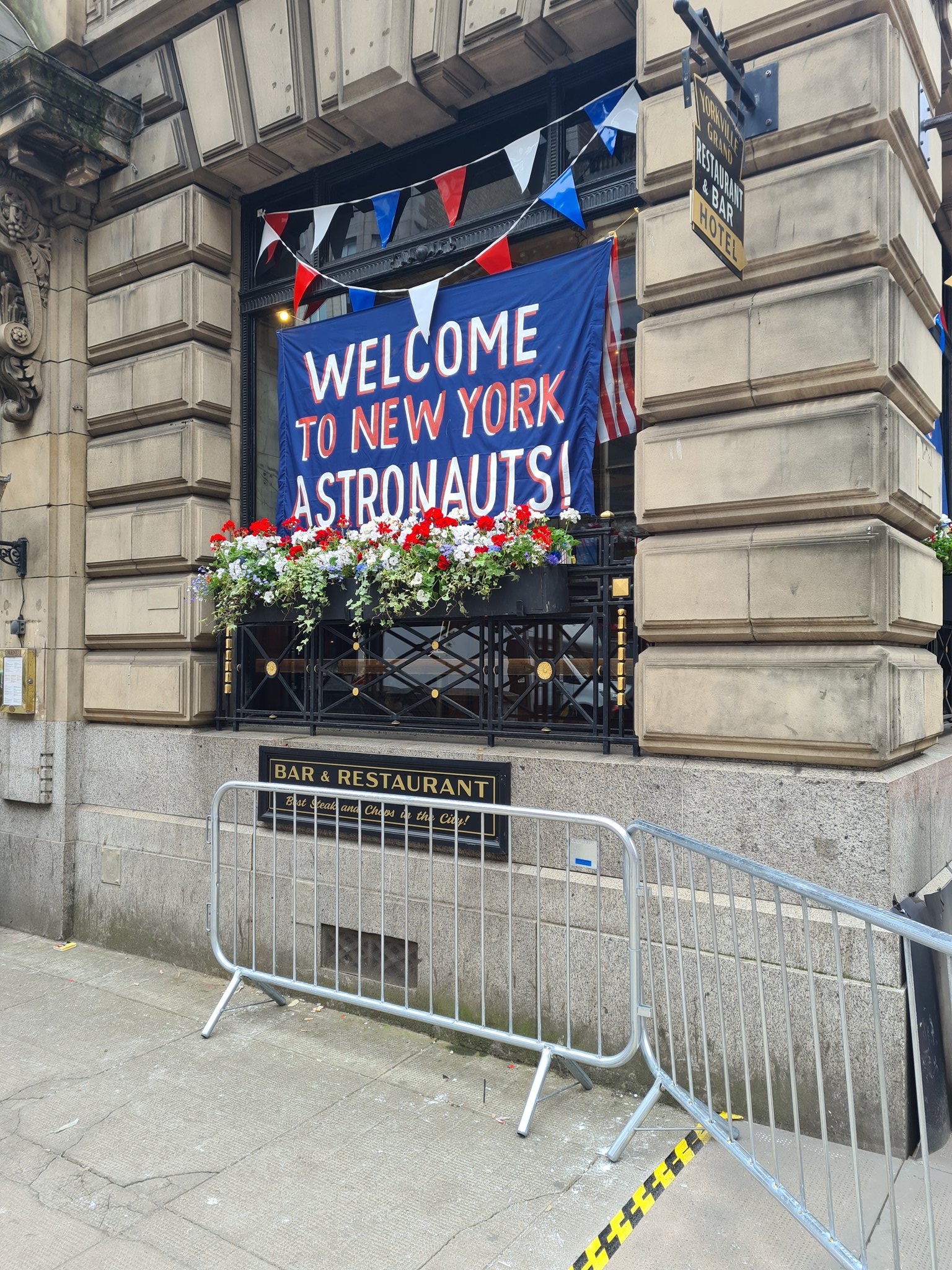 Indy5set_WelcomeAstronauts A welcome sign in 1969 NYC, decorated on a ticker tape parade route for the Apollo 11 crew in INDY 5.