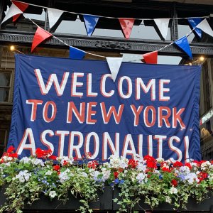 Indy5set_WelcomeToNY A welcome sign in 1969 NYC, decorated on a ticker tape parade route for the Apollo 11 crew in INDY 5.