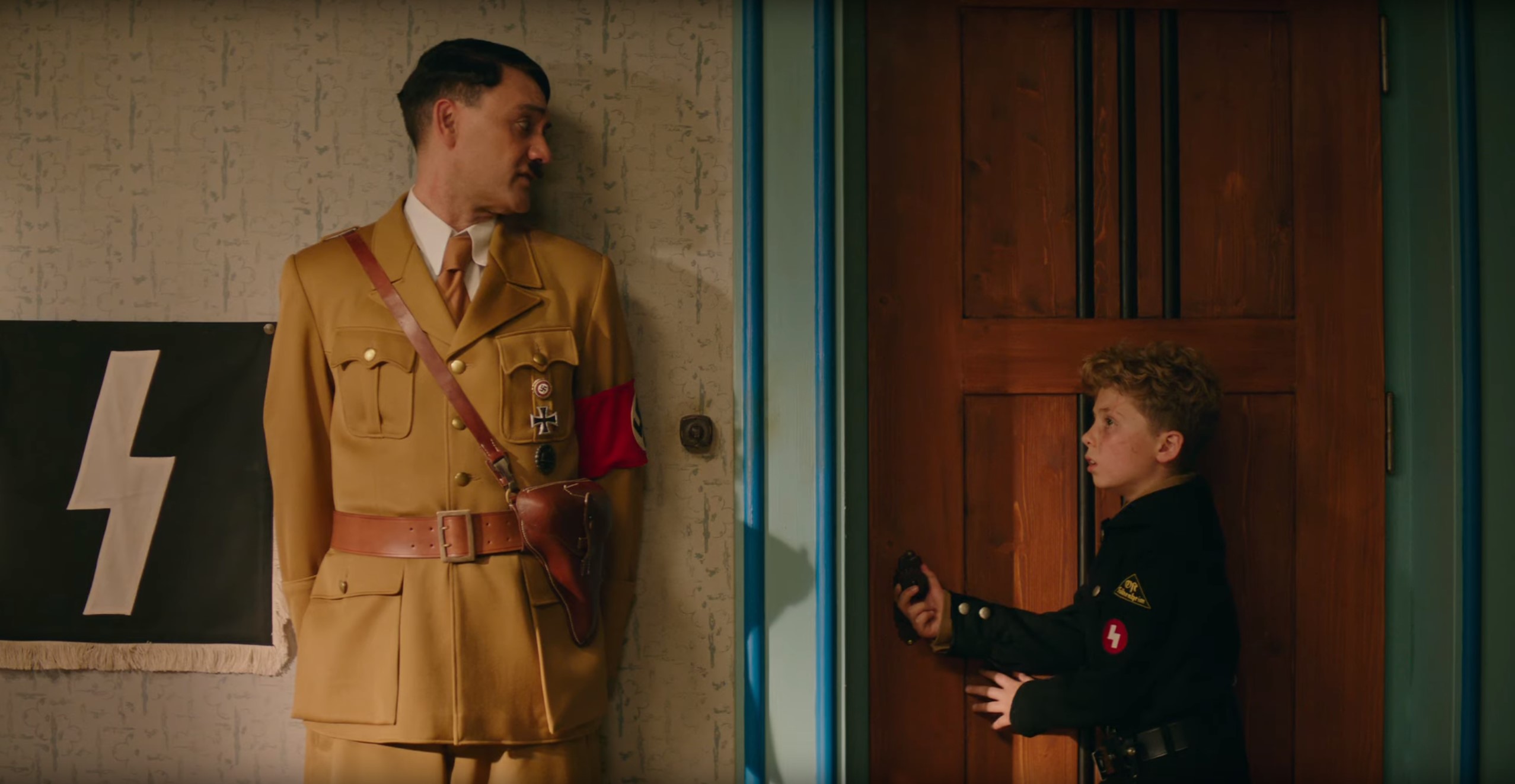 JojoRabbit_HitlerHiding Taika Waititi (Hitler) and Roman Griffin Davis (Jojo) star in the World War II satire-fable JOJO RABBIT (2019)