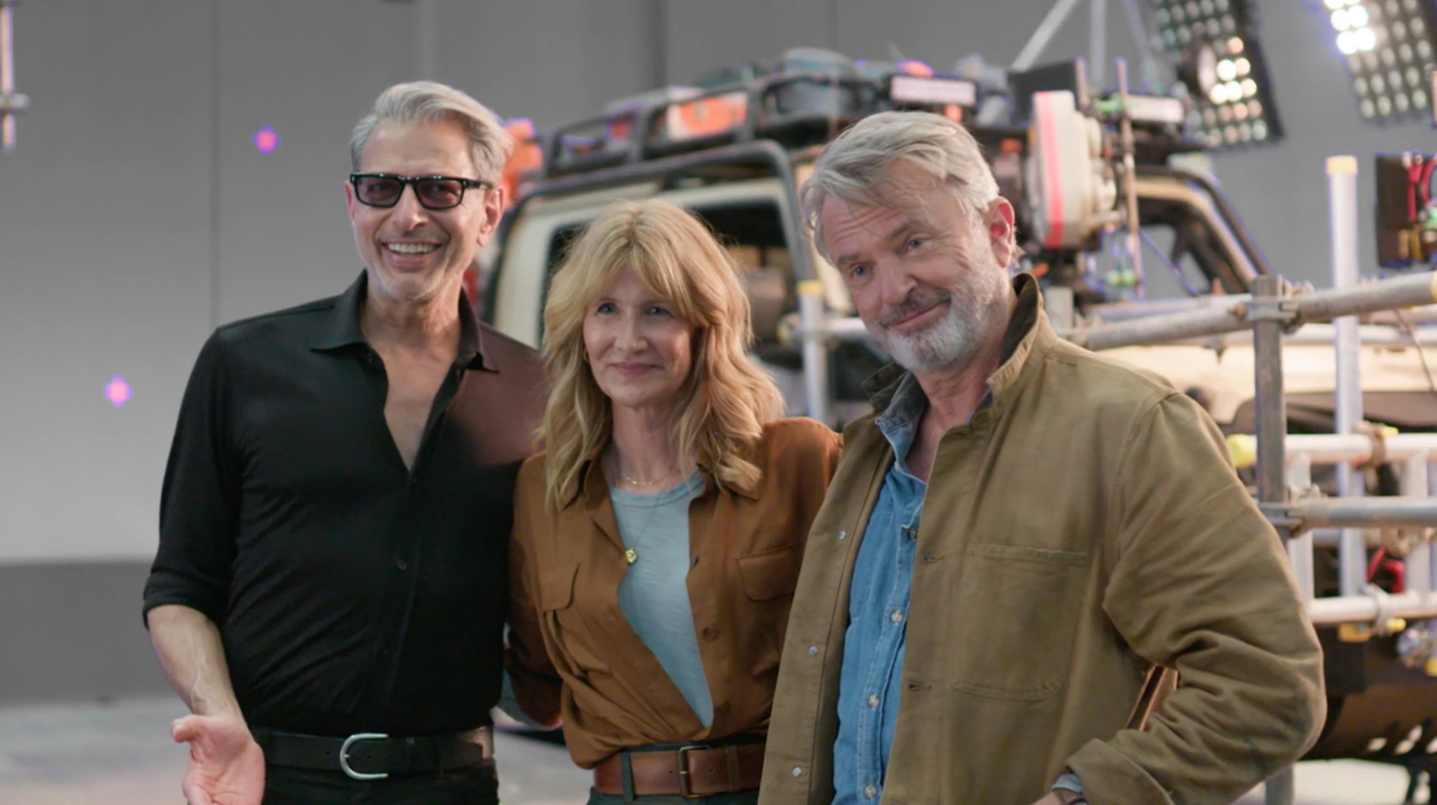 JurassicParkDominion_GoldblumDernNeillBTS Jeff Goldblum, Laura Dern, and Sam Neill on the set of JURASSIC WORLD DOMINION (2022)