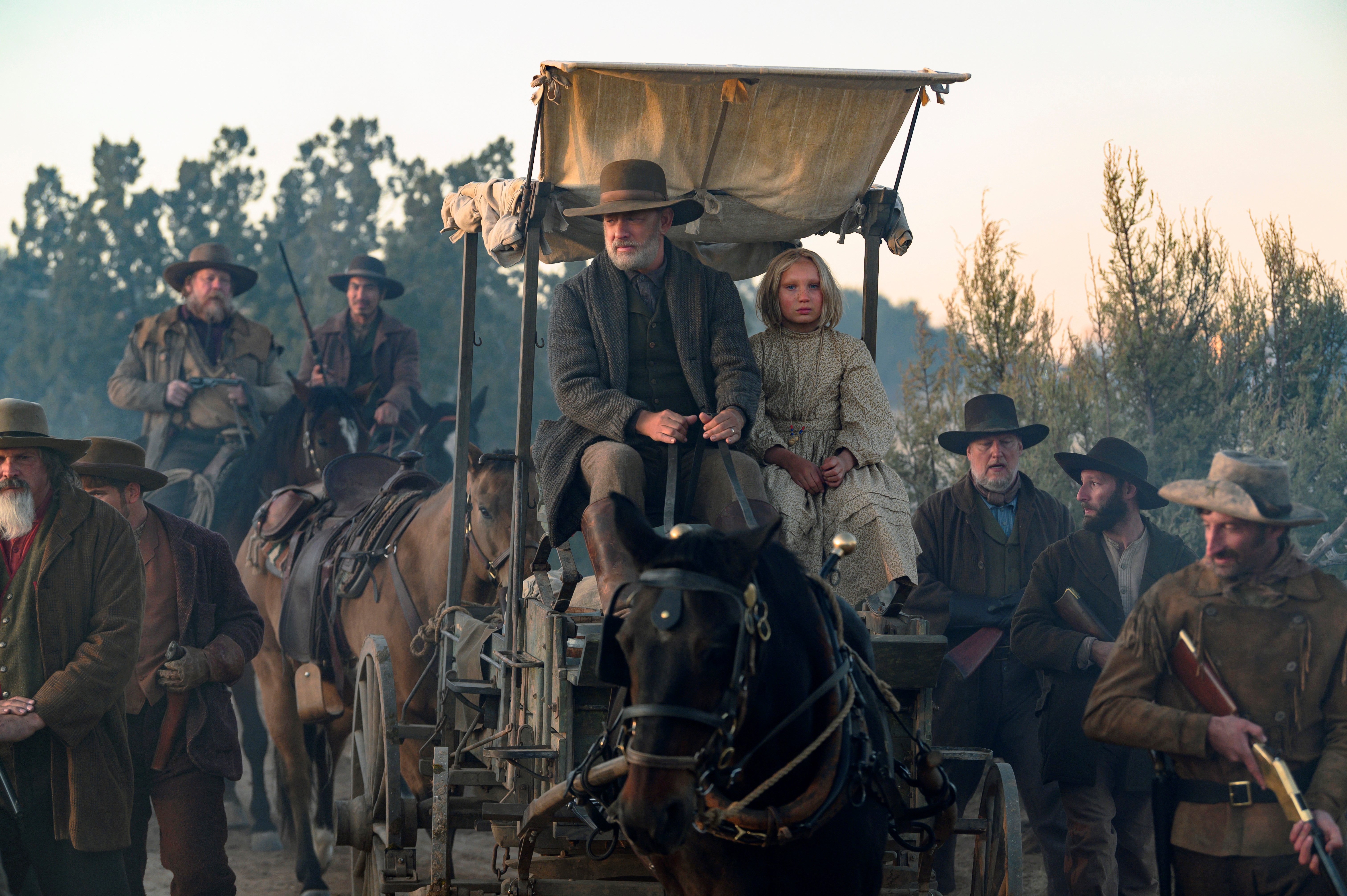 (from left, center) Captain Jefferson Kyle Kidd (Tom Hanks) and Johanna Leonberger (Helena Zengel) in News of the World, co-written and directed by Paul Greengrass.