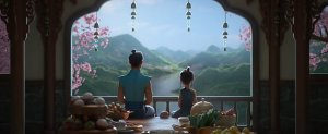 Chief Benja and his daughter Raya meditate together in Walt Disney Animation’s RAYA AND THE LAST DRAGON (2021)