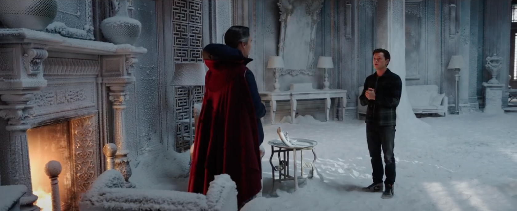 SpiderManNoWayHome_DrStrangePeterFireplace Peter Parker talks with Doctor Strange in his snow-filled home, in SPIDER-MAN: NO WAY HOME (2021)