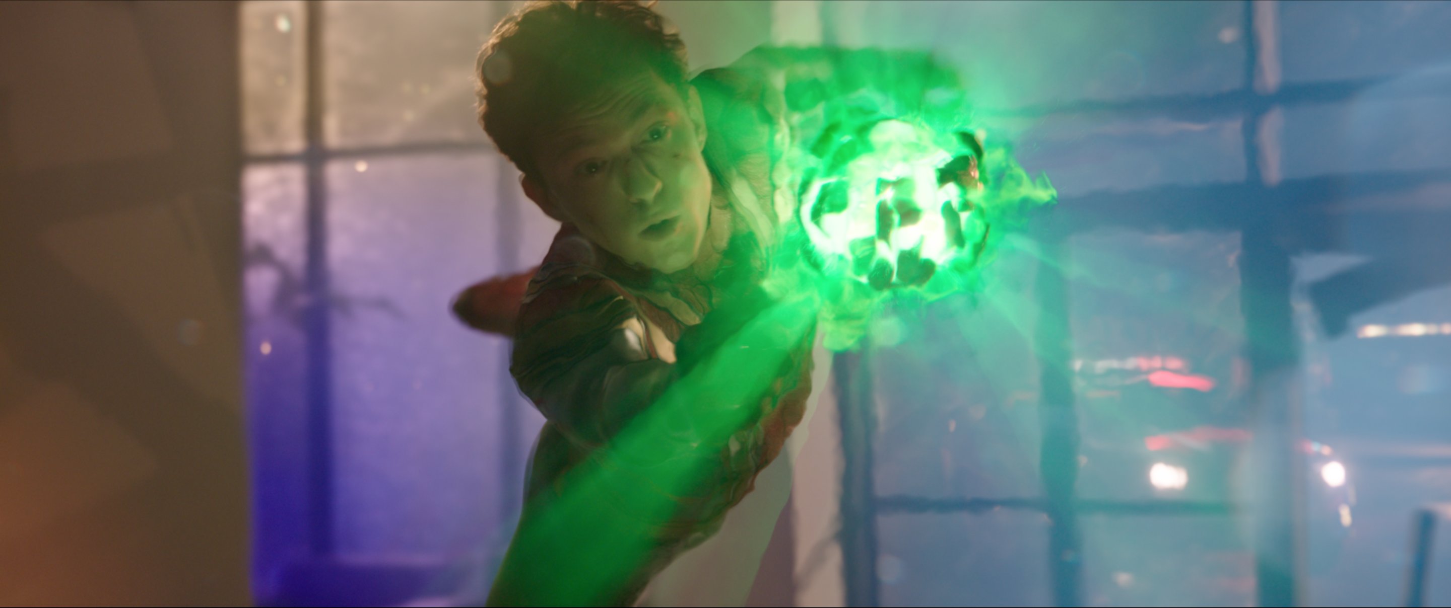 SpiderManNoWayHome_SpiderGoblinGrab Spider-Man (Tom Holland) leaps for a Goblin grenade in SPIDER-MAN: NO WAY HOME (2021)
