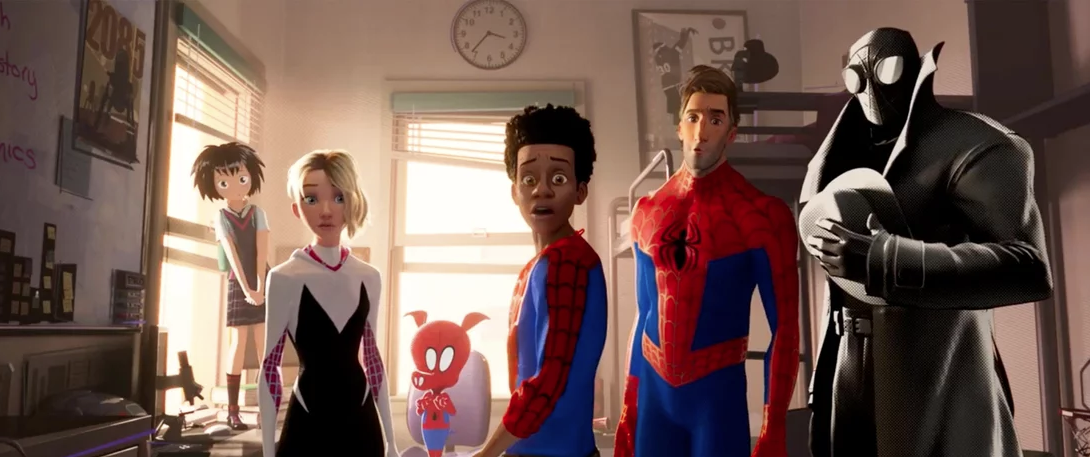 Gwen Stacey, Spider-Ham, Miles Morales, Peter Parker, and Spider-Man Noir in SPIDER-MAN: INTO THE SPIDER-VERSE (2018)