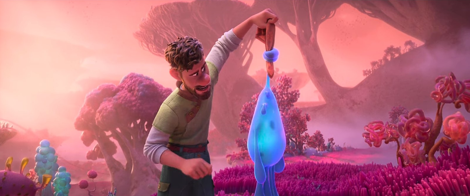 Searcher Clade (voice of Jake Gyllenhaal) inspects a weird blue creature in the Walt Disney animated adventure STRANGE WORLD (2022)