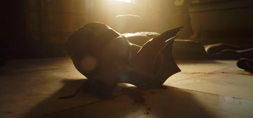 TheFlash_BatmanCowlBlood The cowl of Ben Affleck’s Batman lays on the ground, draining blood, in an image from THE FLASH (2022)