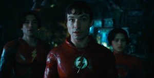 Ezra Miller plays two different Flashes from two different dimensions, accompanied by Supergirl (Sasha Calle) in the batcave of Michael Keaton’s Batman in THE FLASH (2022)
