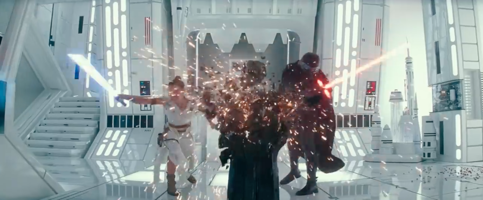 Rey (Daisy Ridley) and Kylo Ren (Adam Driver) destroy the relic of Darth Vader’s helmet in STAR WARS: THE RISE OF SKYWALKER (2019)